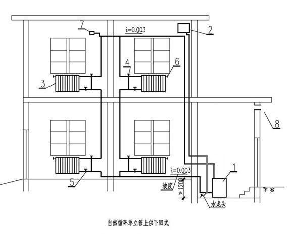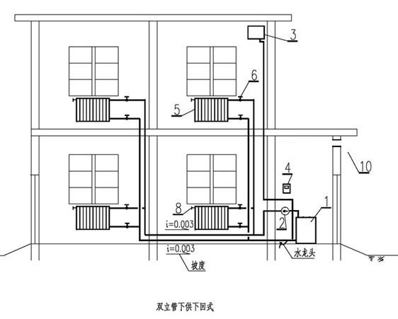 3、供暖管道敷设时,应保持一定的坡度,气水同向流动的热水管道,不小于0.003,气水逆向流动的热水管道不小于0.005,立管与散热器连接的支管不小于0.01.